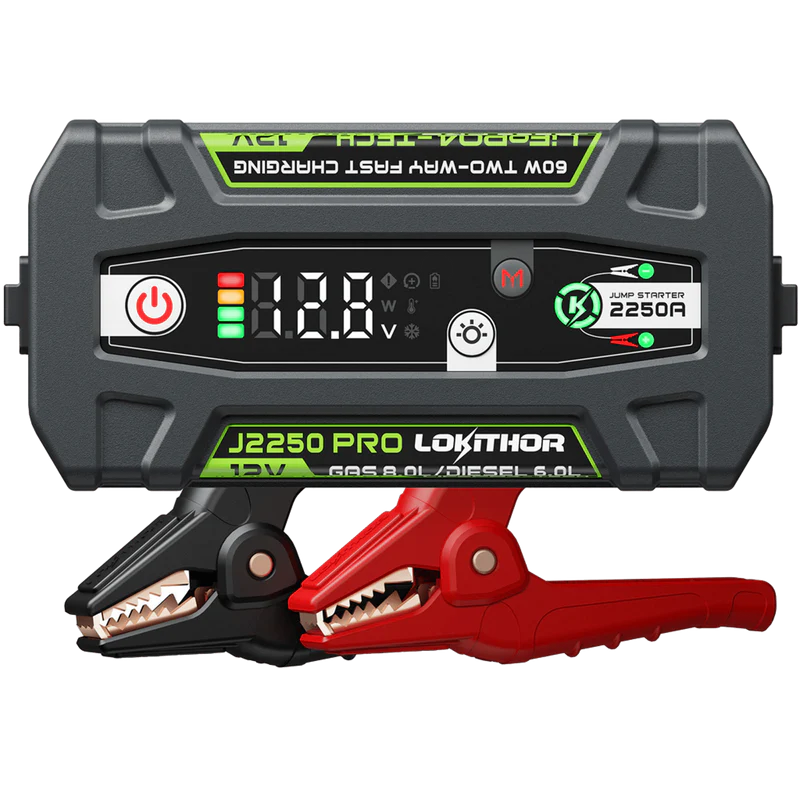 The LOKITHOR J2250PRO LiFePO4 cordless jump starter is a high-performance jump starter that delivers an impressive 2250Amp start current, enabling it to achieve up to 60 jump starts after a full charge. Whether you need to jump-start your vehicle in an emergency situation or simply want to have a dependable device on hand, the LOKITHOR J2250PRO LiFePO4 jump starter is a trustworthy choice that you can count on.